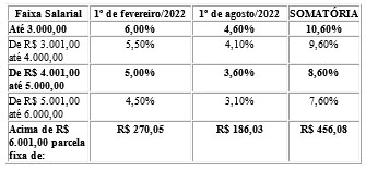 II-) O índice de reajuste da segunda parcela será aplicado em 1º de agosto/22, sobre o salário de 31.01.2022 não retroativo, ou seja, a partir de 1º de agosto/22 o índice de reajuste salarial corresponderá a somatória dos dois índices, conforme a faixa salarial, sendo aplicado sobre o salário de 31.01.2022, não havendo retroatividade.