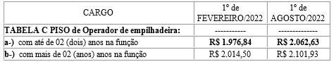 C -PISO DE OPERADOR DE EMPILHADEIRA: Para os empregados e trabalhadores com qualificação profissional, que executam movimentação de produtos, mercadorias e materiais com auxílio de máquinas empilhadeiras, transpaleteiras ou quaisquer outros equipamentos de movimentação de cargas inscrito na CBO sob n° 7822-20, fica assegurado, aos que laboram com menos de dois anos a função, salário mínimo normativo no valor de: