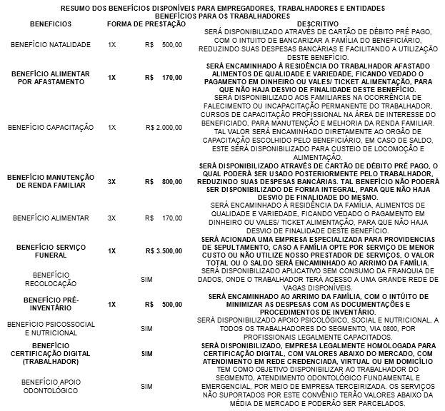 Parágrafo Décimoprimeiro– Para lisura e transparência na prestação dos benefícios, segue abaixo um resumo e breve descritivo da forma em que eles serão disponibilizados. Tal procedimento é necessário para que não haja desvio de finalidade do benefício a ser disponibilizado e deverá ser rigorosamente observado, devido ser caráter social, emergencial e de natureza alimentícia. A íntegra do Manual de Orientação e Regras que regem a prestação dos benefícios estará registrado em cartório e disponível no website da gestora.