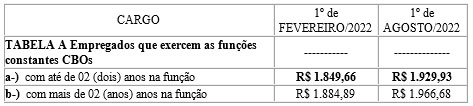 TABELA A - Para os empregados e trabalhadores que exercem a funções nos CBOS Nº 7801, 7801-05, 7841, 7832-15, 7832-20, 5211-25, 4141-05, 4141-10, 4142-15, 3423-10, 3421-10, 3421-5, 3421-25, 3421-10, 4142, 3421-25, 7832-25, 4141-15, 7832-05, 7832-10, 3423-15, 7828-20, 1226, 7841-05, 7841-10, 3423-15, 4141-15, 7801, 7841, 1416,7847-15,7832-20, 7842, 8412-10, 7822-20, 7822, entre outras), (artigo 613 inciso IV da CLT), quais sejam: movimentadores de mercadorias de carga e descarga manual, carregador, contagem de volumes, raqueamento de carga anotação de suas características, stretch, procedência ou destino, verificação do estado das mercadorias, assistência à pesagem, arrumação de caixas ou sacas sobre os pallets, remoção, acomodação e demais serviços correlatos, nas operações de carregamento e descarga de embarcações, aos quais será garantido um Salário Mínimo Normativo no valor de: